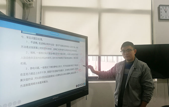 “絨、棉填充一體化,維保方面會很復(fù)雜嗎?”“PLC原理是怎樣的?”“模塊調(diào)試怎么做?”……帶著一系列的疑問,10多位來自武漢、青島、合肥、南通、石獅、東莞等地的代理商技術(shù)人員在上周齊聚常熟,參加了百聯(lián)開展的新年首場代理商售后服務(wù)技術(shù)培訓(xùn)。