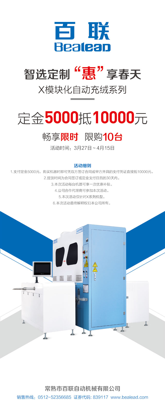 該方案專門針對X模塊化自動充絨系列,可享“定金5000抵10000元”的優(yōu)惠,每臺機器可享一次優(yōu)惠補貼,即使是代理商也可以參加。要了解更多詳細內(nèi)容,就前往東莞展或電詢百聯(lián)吧,誠意驚喜等著您!