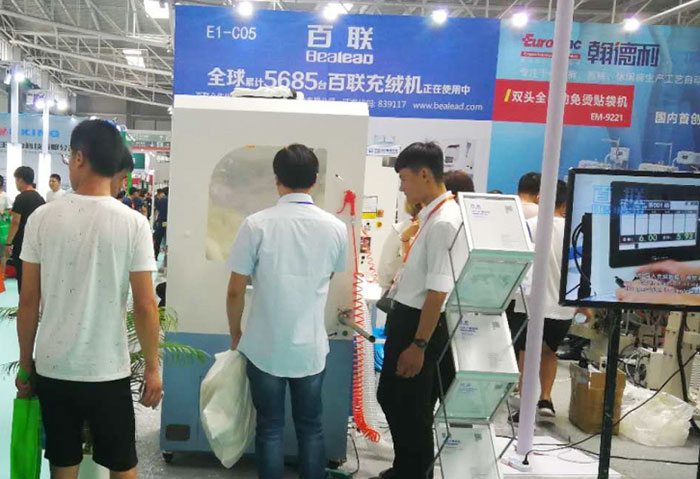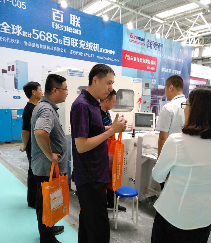 本屆青島展會以“貿(mào)易、綠色、智能化、解決方案”為主題。百聯(lián)亮相E2館的C05展位,重點展示了全新推出的2601X型模塊化自動充絨機、102B迷你機型以及經(jīng)典的402D雙口絨棉一體機,繼續(xù)鞏固自身在纖維自動填充設備領域的地位。