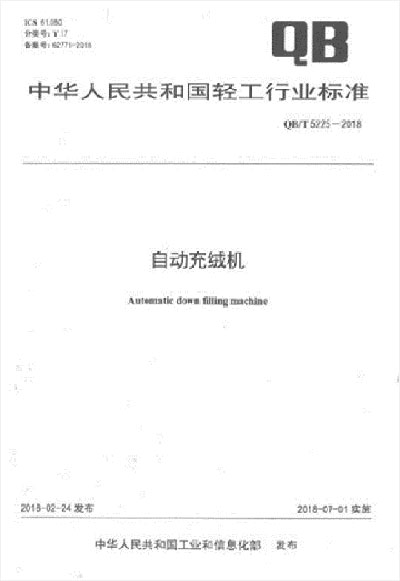 自2018年7月1日起,由百聯(lián)牽頭主起草的編號(hào)為QB/T5225-2018 號(hào)的“自動(dòng)充絨機(jī)”行業(yè)推薦性標(biāo)準(zhǔn)正式實(shí)施了。該標(biāo)準(zhǔn)規(guī)定了自動(dòng)充絨機(jī)的術(shù)語和定義、產(chǎn)品分類、要求、試驗(yàn)方法、檢驗(yàn)規(guī)則、標(biāo)志、包裝、運(yùn)輸和貯存,適用于自動(dòng)充絨機(jī),其他充填物的類似設(shè)備可參照?qǐng)?zhí)行。