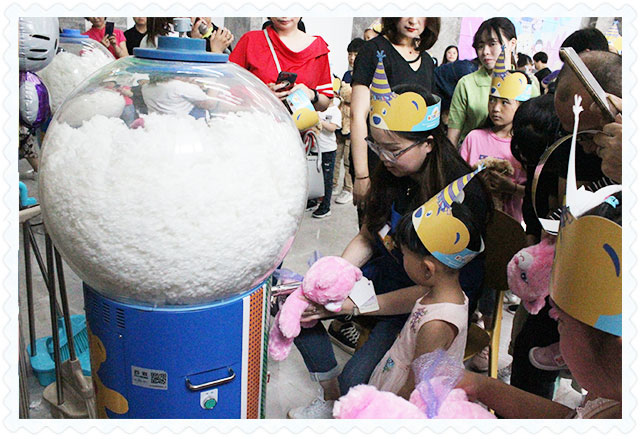 小朋友用爸爸媽媽設(shè)計生產(chǎn)的機器給玩偶充棉