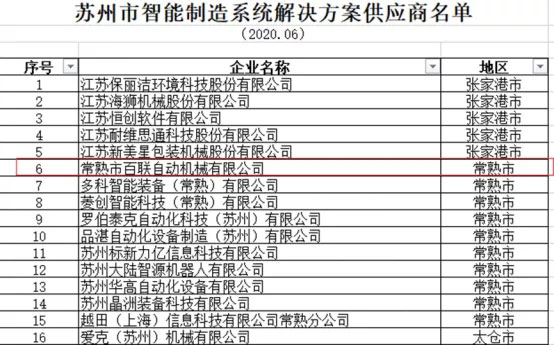 近日,蘇州市工信局公布了《蘇州市智能制造解決方案供應(yīng)商》的名單,全市共有141家企業(yè)入選,其中常熟市10家。我司(常熟市百聯(lián)自動機(jī)械有限公司)入選在列!