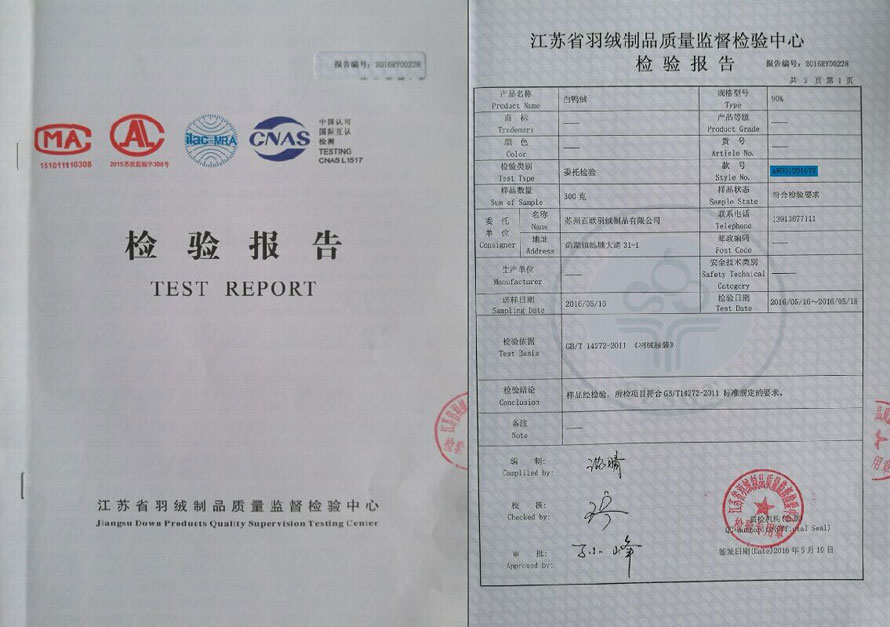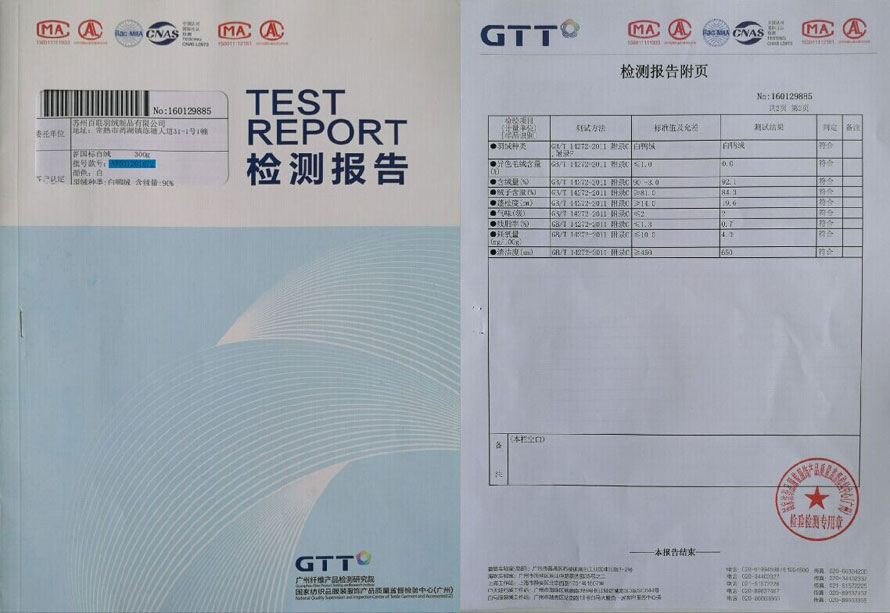 百聯(lián)分別委托江蘇省羽絨制品質(zhì)量監(jiān)督檢驗中心、廣州纖維產(chǎn)品檢測研究院檢測并出具報告。只有兩份報告同時合格后才會入庫;
